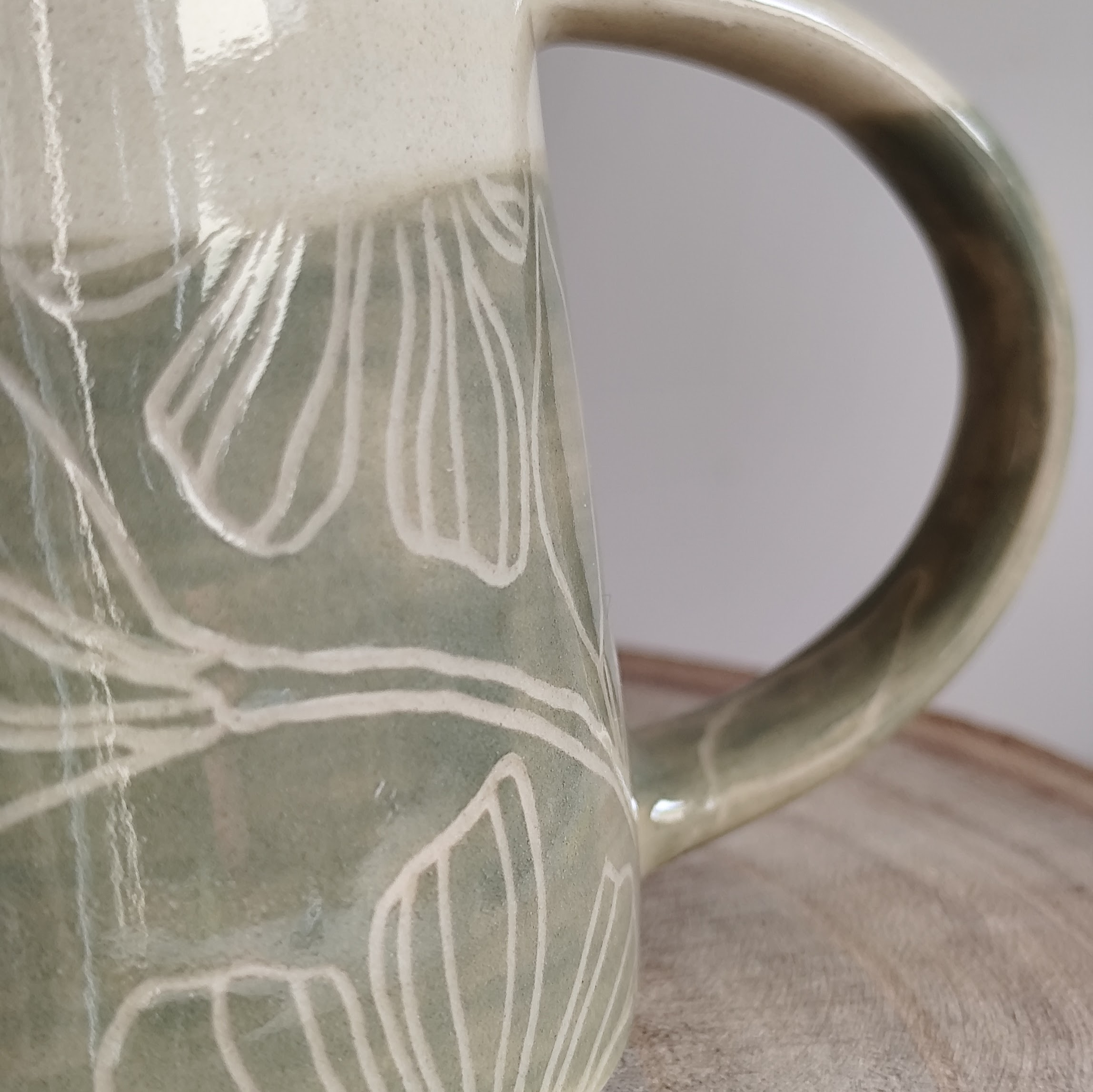 Mug en céramique artisanale décoré grâce à la technique du sgraffite – Motif végétal vert